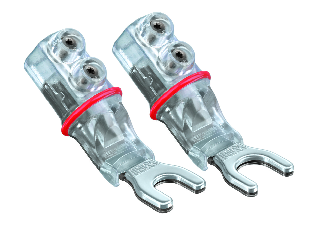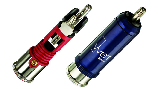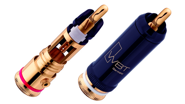 Esto impide tanto la generación de producirse corrientes inducidas/efectos peliculares como los problemas de fase o de acumulación de masa resultantes. *Potencia manejable: Con la nueva tecnología de WBT es posible crear conectores para señales de nivel alto y bajo con un ancho de banda del orden de GHz que permiten tratar la señal de audio con una fiabilidad no alcanzada hasta la fecha. En el caso concreto de las señales de nivel alto, es posible manejar corrientes continuas de 10 amperios y picos de 120 amperios.