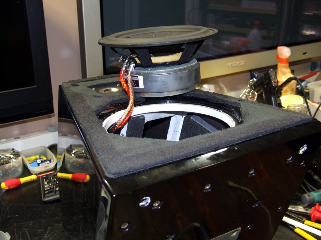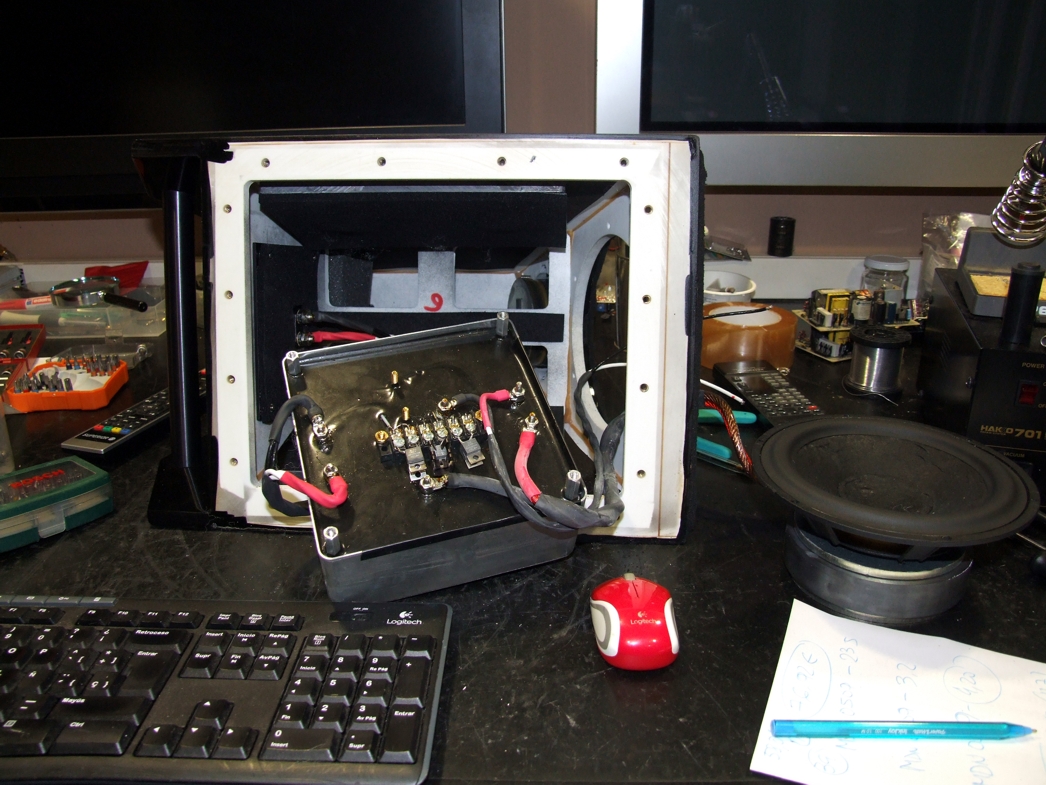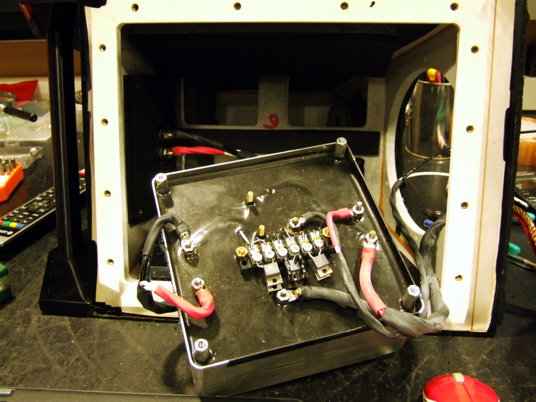 Al cabo de un par de días, nos llama de nuevo para decirnos que nos trae el cabezal, que le han revisado el tweeter y ya funciona correctamente, pero sigue sin sonar. Al poco rato tenemos en SAT a esta fabulosa creación de los laboratorios Wilson. Efectivamente, el midwoofer de Scanspeak está funcionando correctamente, pero el tweeter no. Comprobación del estado de la bobina del transductor de agudos, correcta. Prueba del propio componente fuera de su caja y también perfecto. Todos los tiros apuntan al filtro. Desmontamos el midwoofer y ya vemos una cajita metálica que evidentemente son los filtros del cabezal. Intentamos sacar dicha caja, pero nada de nada. Toda la unidad es un elemento hiper reforzado con metal por todas partes que hace que se complique el trabajo.