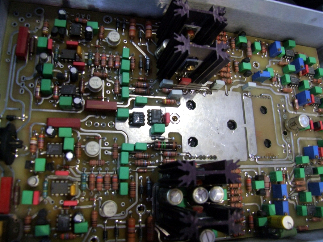 La unidad no arrancaba correctamente. Alguien la había manipulado colocando un tornillo en un lugar de la placa donde lo que hacía era un cortocircuito que había destruido una resistencia de alimentación. Se pudo comprobar con la otra parte del DAC [Mark Levinson, siempre trabaja con configuración doble monofónica, hasta en la alimentación], por lo que se pudo comprobar como este tornillo no iba colocado es este poste, que va conectado a masa. Otro de los handicaps para medir, es que las masas no son comunes, cada canal lleva su masa por separado, así como la alimentación general. Una vez solventado este problema teníamos otro, la unidad arrancaba, funcionaba, detectaba señal de entrada, que la podíamos monitorizar en la salida digital de la unida que enviada a otro DAC externo obteníamos sonido. Es decir, se «muteaba» por alguna parte.