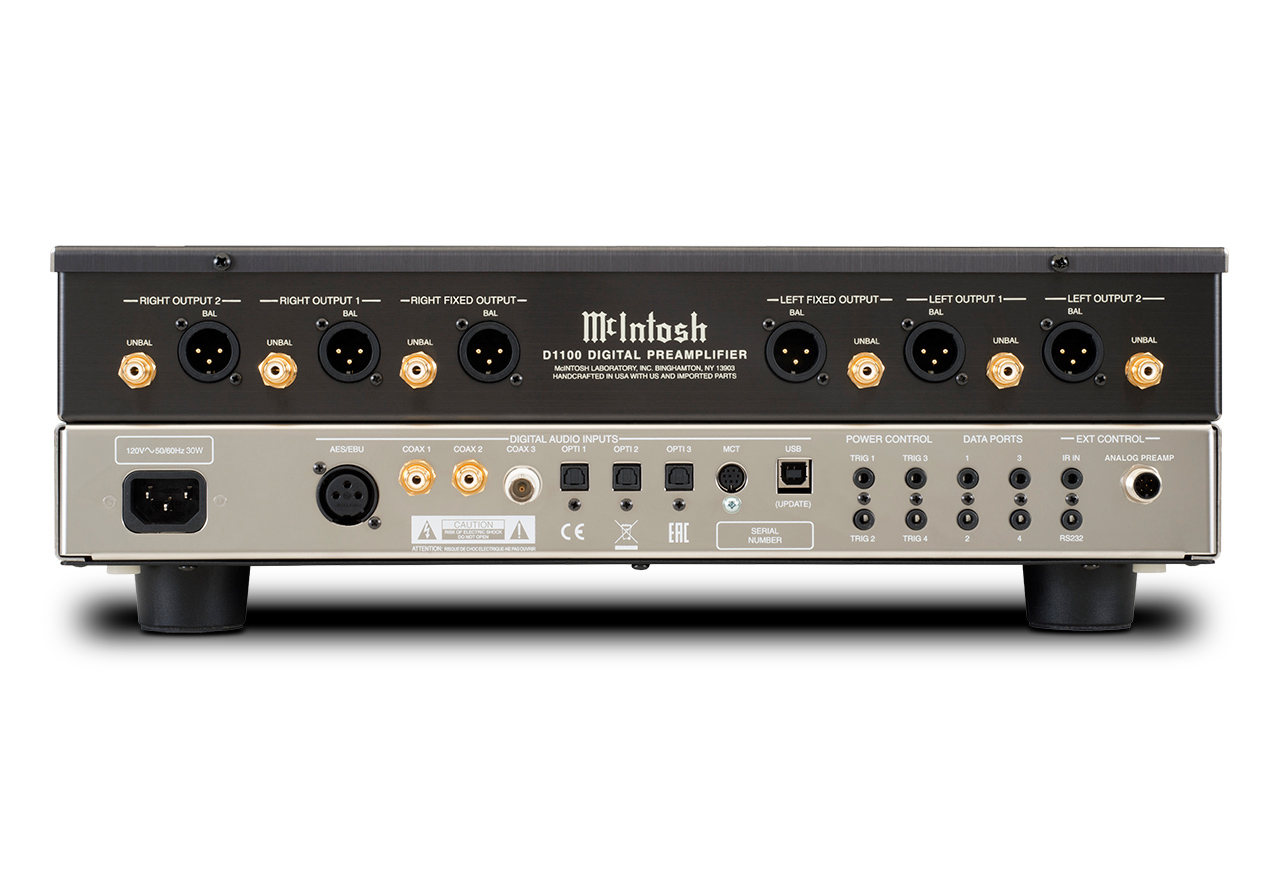 Se incluyen entradas suficientes (9 para ser exactos) para mantener incluso conectado el sistema digital más grande como 3 ópticos, 3 coaxiales (2 RCA y 1 BNC), además de 1 entrada MCT, AES / EBU y USB. La entrada USB acepta señales de hasta 32 bits/384 kHz y admite reproducción DSD64, DSD128, DSD256, DXD 352.8kHz y DXD 384kHz1. Todas las demás entradas aceptan hasta 24-bit/192kHz. La entrada MCT es exclusiva de McIntosh y permite disfrutar del audio de alta resolución que se encuentra en los SACD a través del transporte MCT450 SACD/CD. Tres juegos de salidas estéreo balanceadas y no balanceadas conectan el D1100 a su sistema. Un conjunto de salidas tiene volumen fijo mientras que los otros dos restantes tienen volumen variable. Las salidas variables también se pueden activar y desactivar para una configuración adicional del usuario.