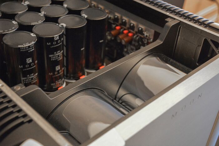 Aunque para un no iniciado, los sorprendentes 8kW de salida son la garantía de que MOON 888 siempre trabajará por debajo de su capacidad, logrando así una mejor calidad de sonido. Mientras su carcasa es de aluminio, con partes fundidas y mecanizadas, sus conectores de altavoz son de rodio de alta resistencia.