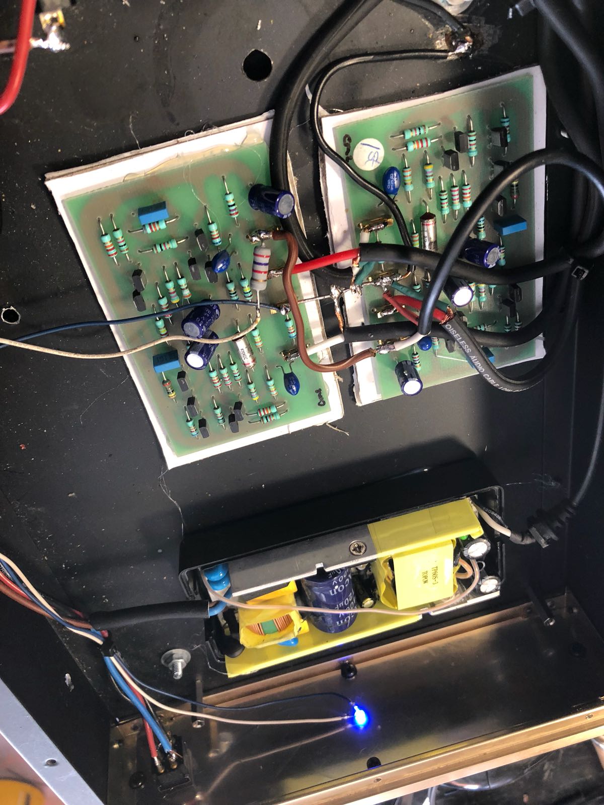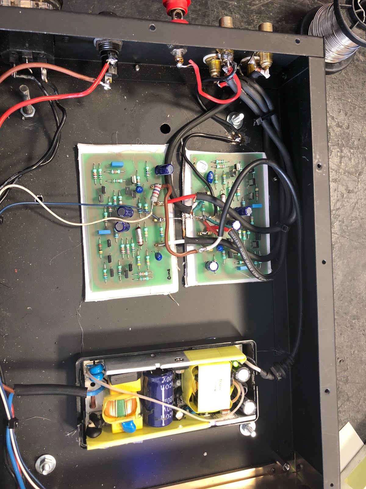 Que hemos hecho?. Simplemente disponíamos de placas de previo de phono de Naim, el modelo NA322, los hemos ensamblado en una caja, hemos ensamblado asimismo una fuente de alimentación. Hemos dotado al prototipo con conectores correspondientes y ya tenemos preamplificador de phono – MM – de alta calidad.
