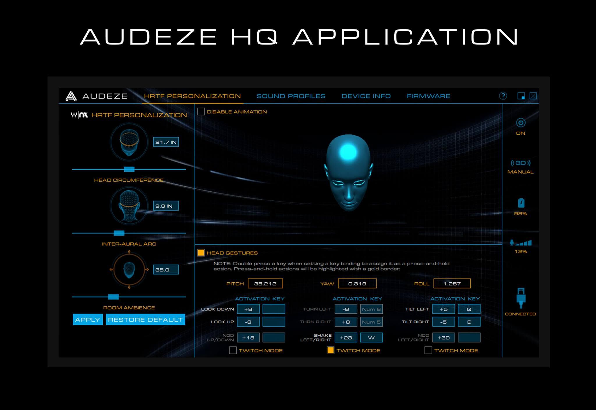 Head Gesture Keybinds ofrece un alto grado de libertad al jugar a videojuegos con Mobius, permitiendo al usuario disfrutar de una experiencia de juego personalizada mediante múltiples opciones manos-libres más allá del teclado y ratón tradicionales. Estas funciones son también una nueva forma de control para jugadores con discapacidades físicas. Head Gesture Keybinds se está probando para un lanzamiento completo con Audeze HQ a principios de 2019. La app Audeze HQ, de descarga gratuita y compatible con Windows y Mac, ofrece personalización HRTF, perfiles de sonido, visualización del head-tracking e información del dispositivo.