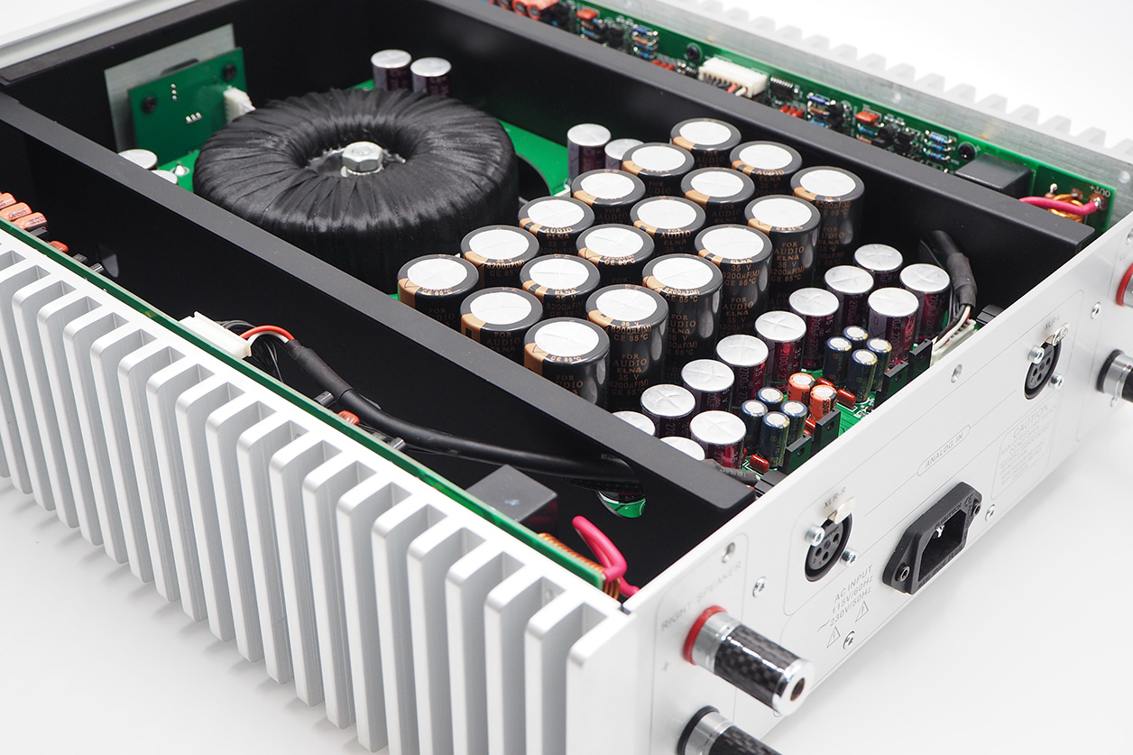 El transformador de potencia de 300VA incorpora blindaje de cobre. 18 piezas de condensadores de gran capacidad (147,600uF) y diodos Schottky rectificadores de conmutación muy rápida, que suministran alimentación de corriente contínua a los railes de energía para ambos canales, son más más que suficientes para esta etapa de configuración modular, que cuentaq con 4 pares de transistores de salida para cada canal.