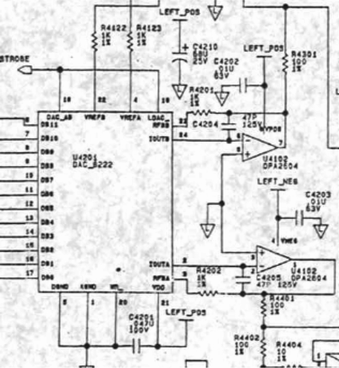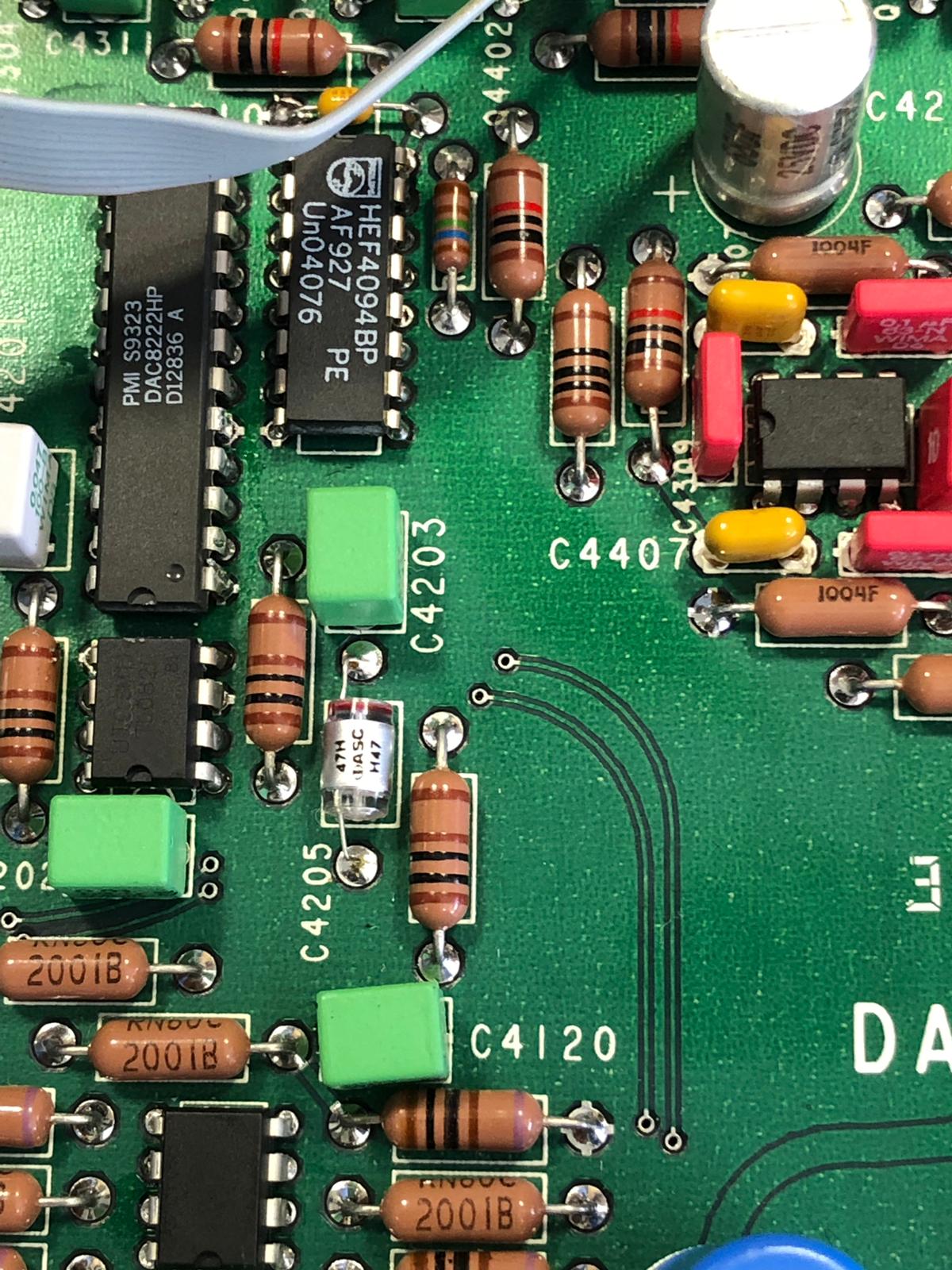Por suerte disponíamos de este circuito integrado DAC, así que se sustituyó ya que todos los tiros apuntaban a este componente. Cabe señalar que por precaución se sustituyeron los integrados doble operacional, ya que no sería la primera vez que nos encontramos con que alguno de ellos está defectuoso y nos genera tensiones no deseadas, ruidos molestos o anomalías que se hacen presente en las propias salidas de dichos equipos, todo un peligro para etapas o cajas acústicas.