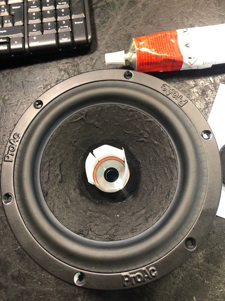 Encolado suspensión Spider (la amarilla, la inferor), así como la suspensión tal y como la conocemos de la parte superior. El detalle del papel es para el óptimo centrado de la bobina. Antes podíamos utilizar, o bien las radiografías que nos entregaban en los hospitales, así como los carretes de fotos. Iban perfectas. En la actualidad en ambos casos no disponemos de ellas, ya que han pasado a mejor vida. Utilizamos papel, ya que también va muy bien para centrar la bobina.