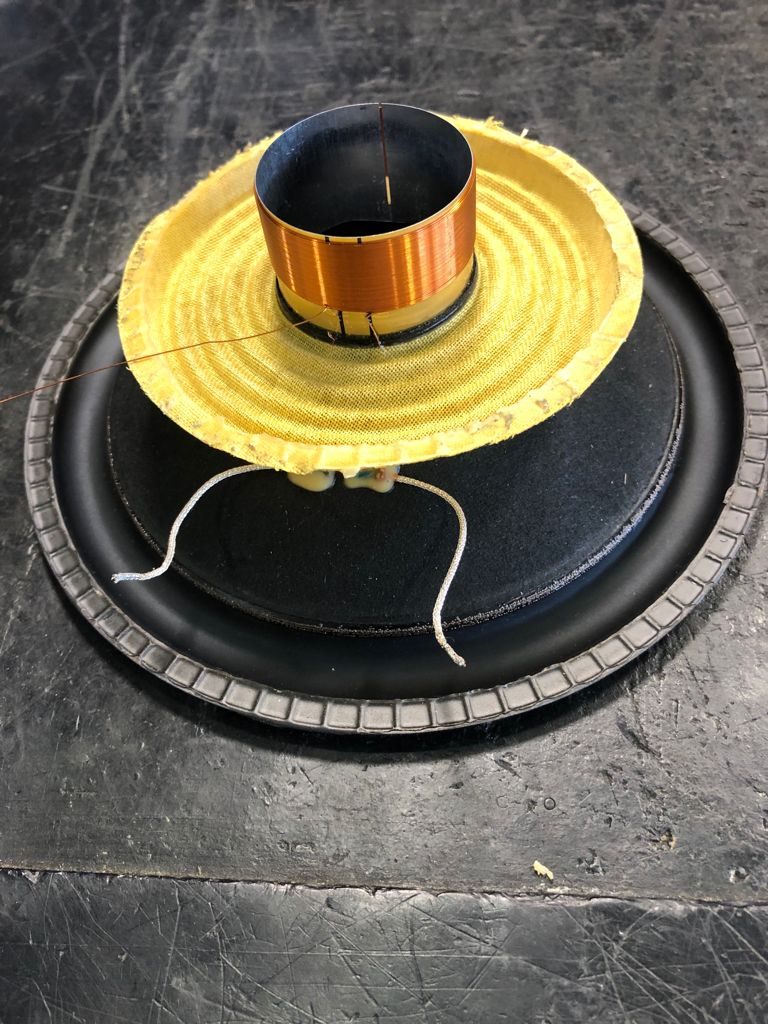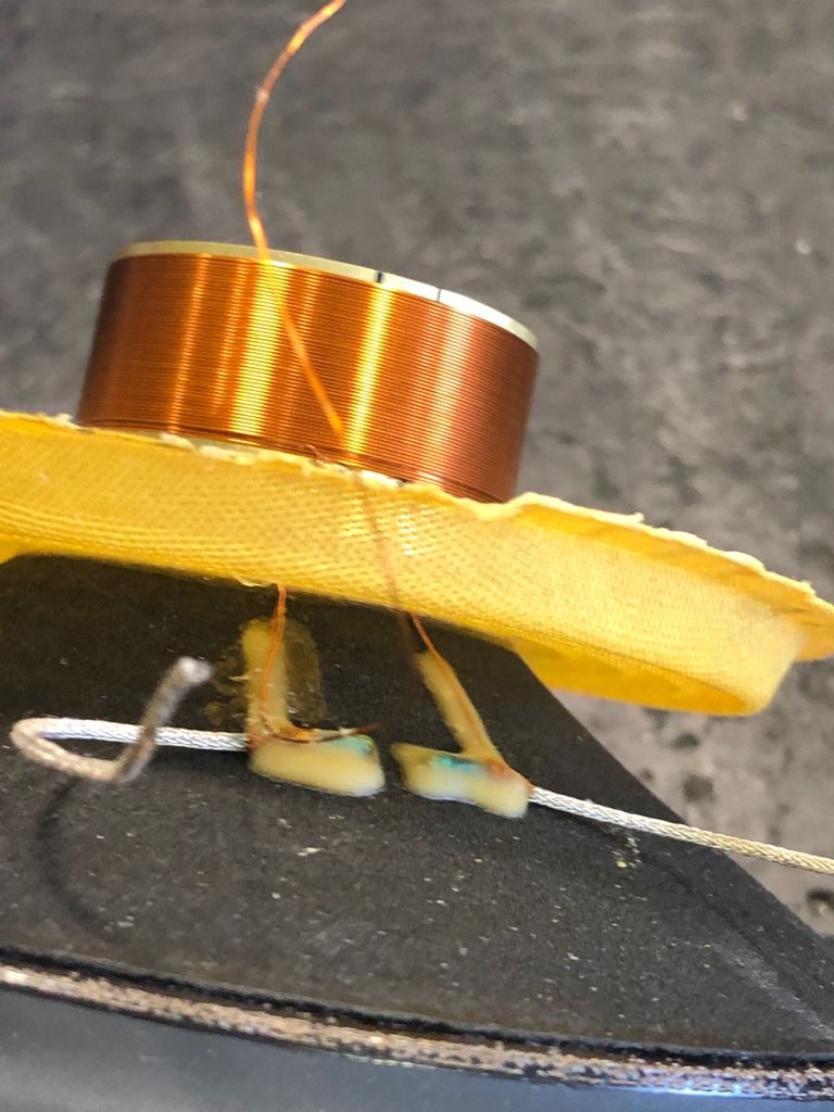 Toca ahora volver a “desandar lo andado”, es decir, una vez la bobina recompuesta, nos toca volver a colocar todo el conjunto en la araña, centrar dicha bobina, ya que si no lo hacemos, el conjunto distorsionará. Detalle de la bobina, con el terminal de la misma con una vuelta menos. A punto para ser montada en su espacio original.