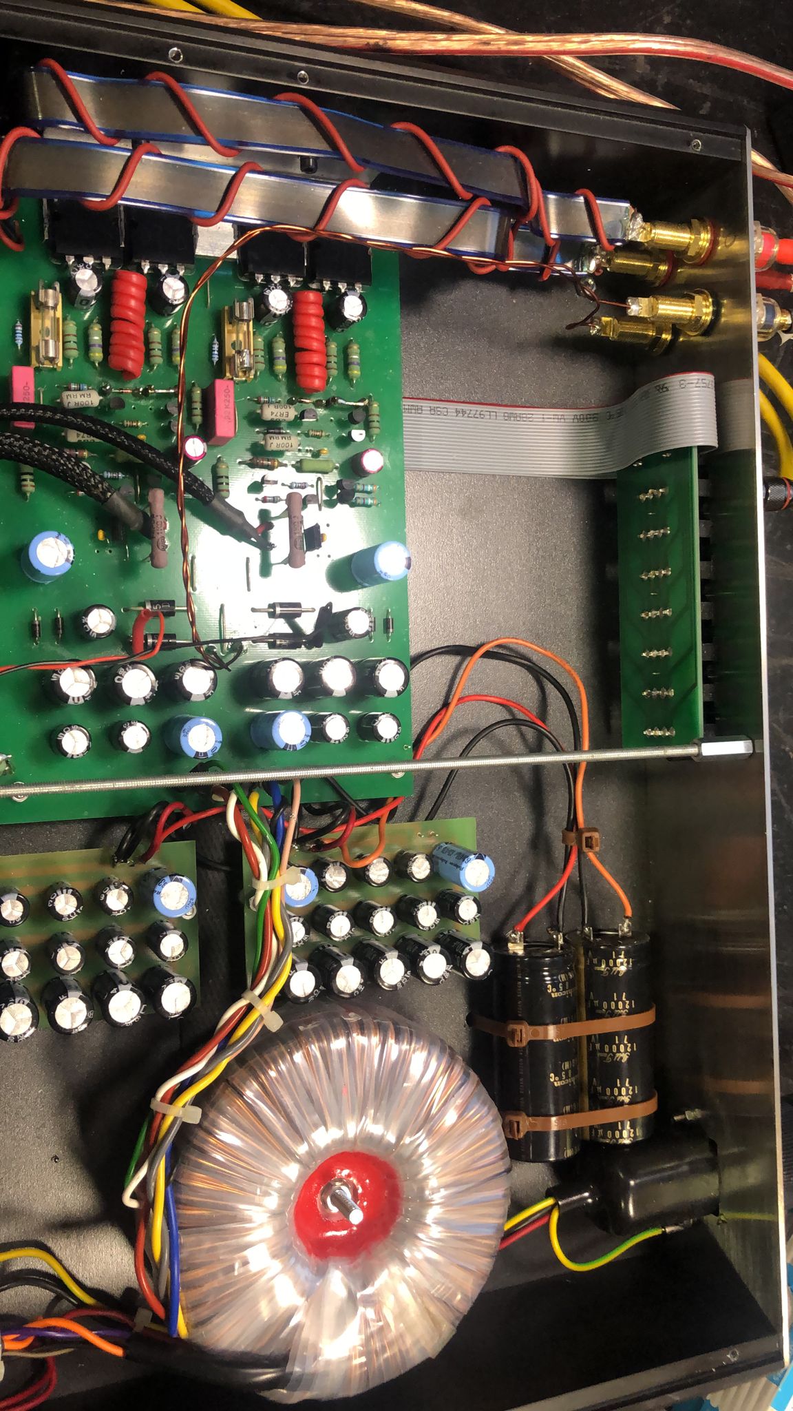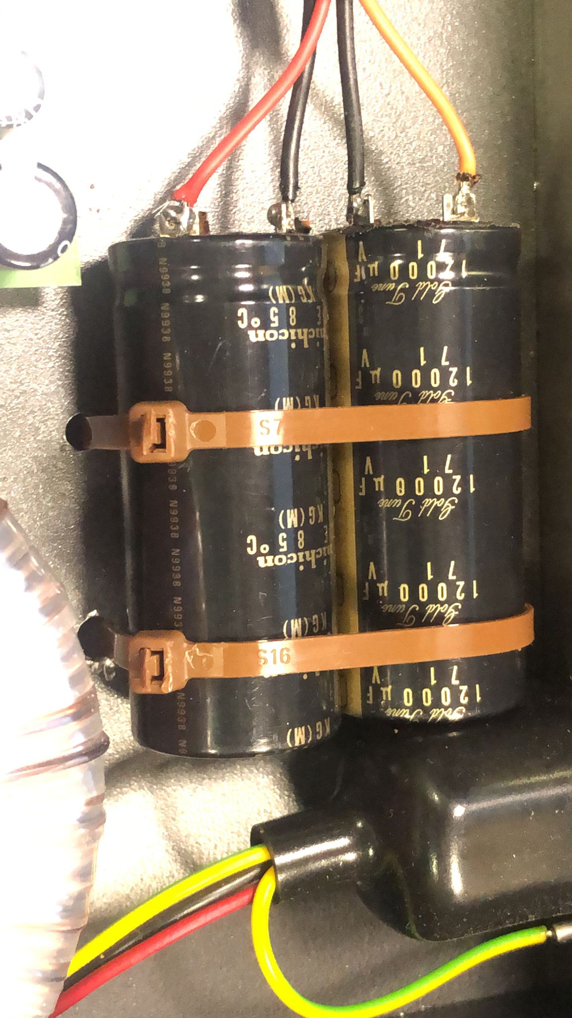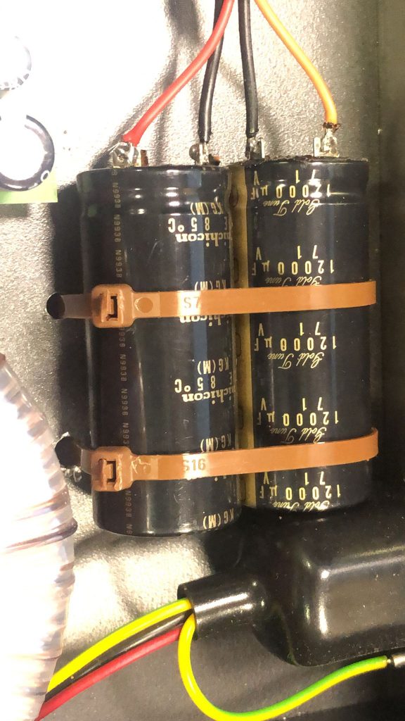 Nos ponemos «manos a la obra» y añadimos un par de electrolíticos de 12.000 uF/70 Voltios por rail de alimentación, con lo que la capacidad total aumentará y por ende la respuesta y sobretodo el «cuerpo» de la música.