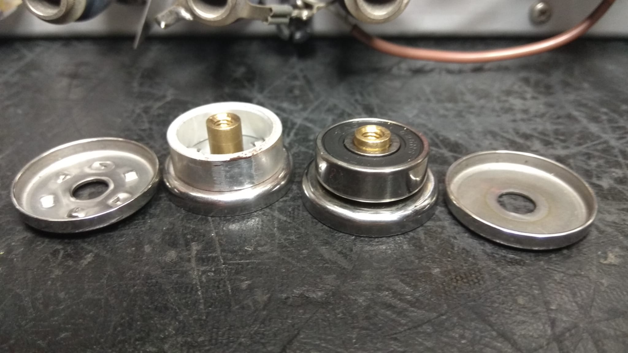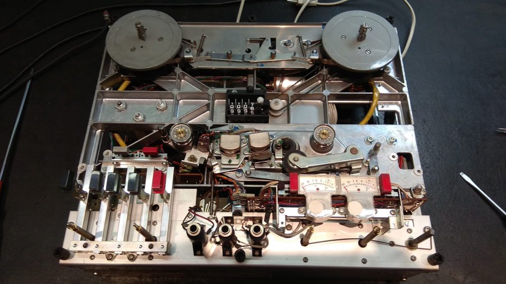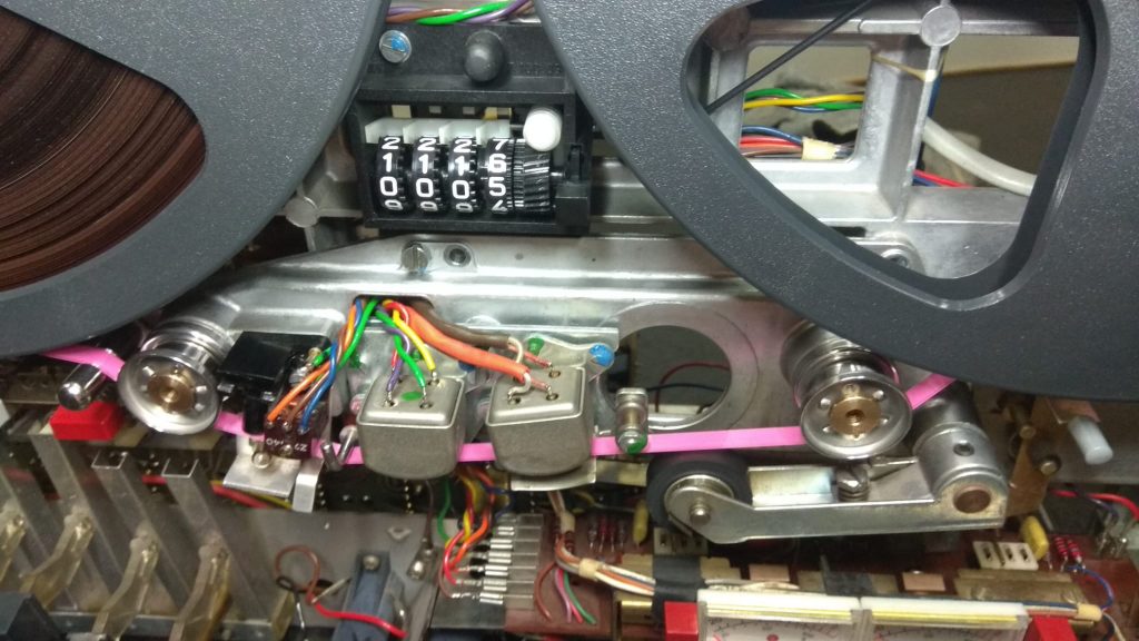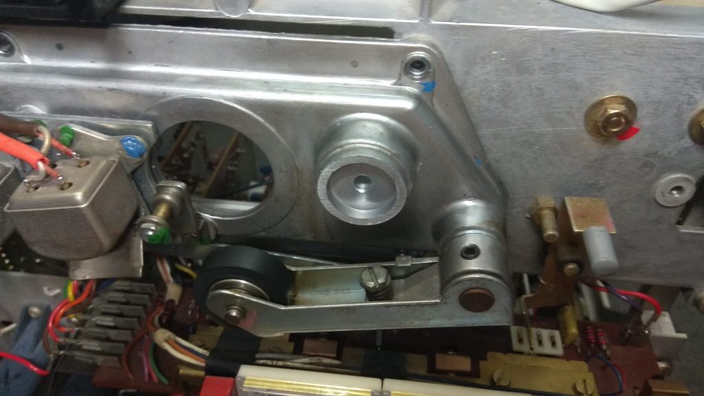 Ya tenemos los motores en marcha, una de las partes, la mecánica «la tenemos funcionando». Funciona, pero no estamos contentos. Este modelo (el original o para diferenciarlo, el MKI), no lleva ni tensor de cinta, ni por donde se desplaza ésta, cojinetes que ayuden a las mecánicas. Nuestra principal obsesión – aparte de dejarlo como un Revox, siempre es que funcione «fino», es decir, una unidad con esta edad, tenemos que evitar a toda costa que los motores sufran más de la cuenta. Como la cinta tiene tendencia a ir forzada por este motivo, le hemos añadido un par de cojinetes. No hemos podido montar un tensor de cinta, ya que la carátula del propio equipo no lo permite.