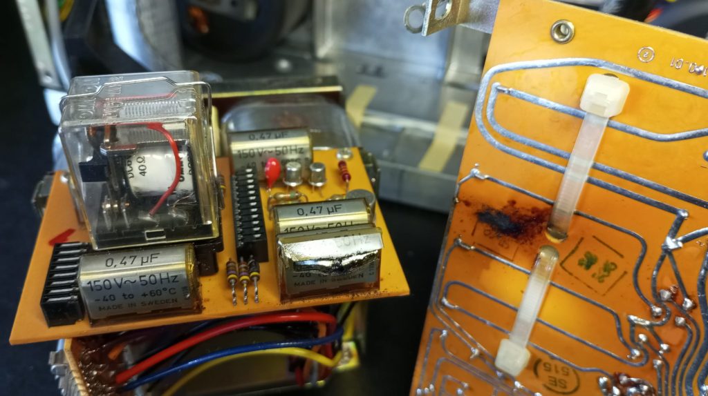 Evidentemente, todo nos lleva a pensar de entrada, en un problema en la fuente de alimentación, y efectivamente, esta estaba dañada. La unidad implemente, como otras de la misma firma, unos condensadores cerámicos, que con los años tienden a degradarse y se cruzan, llevando a la unidad al corte y dejando tras de si, una humareda blanca y el consiguiente «olor» a quemado.
