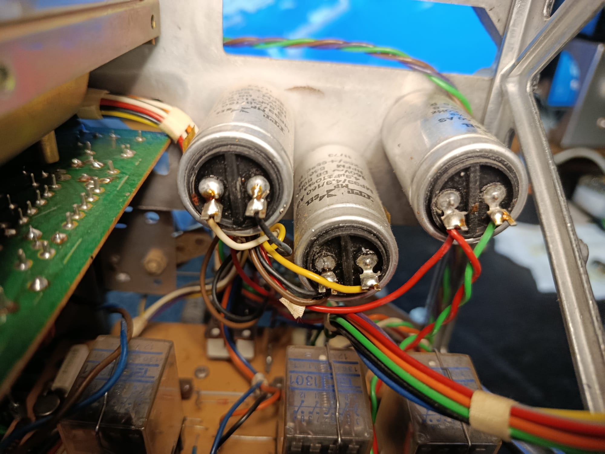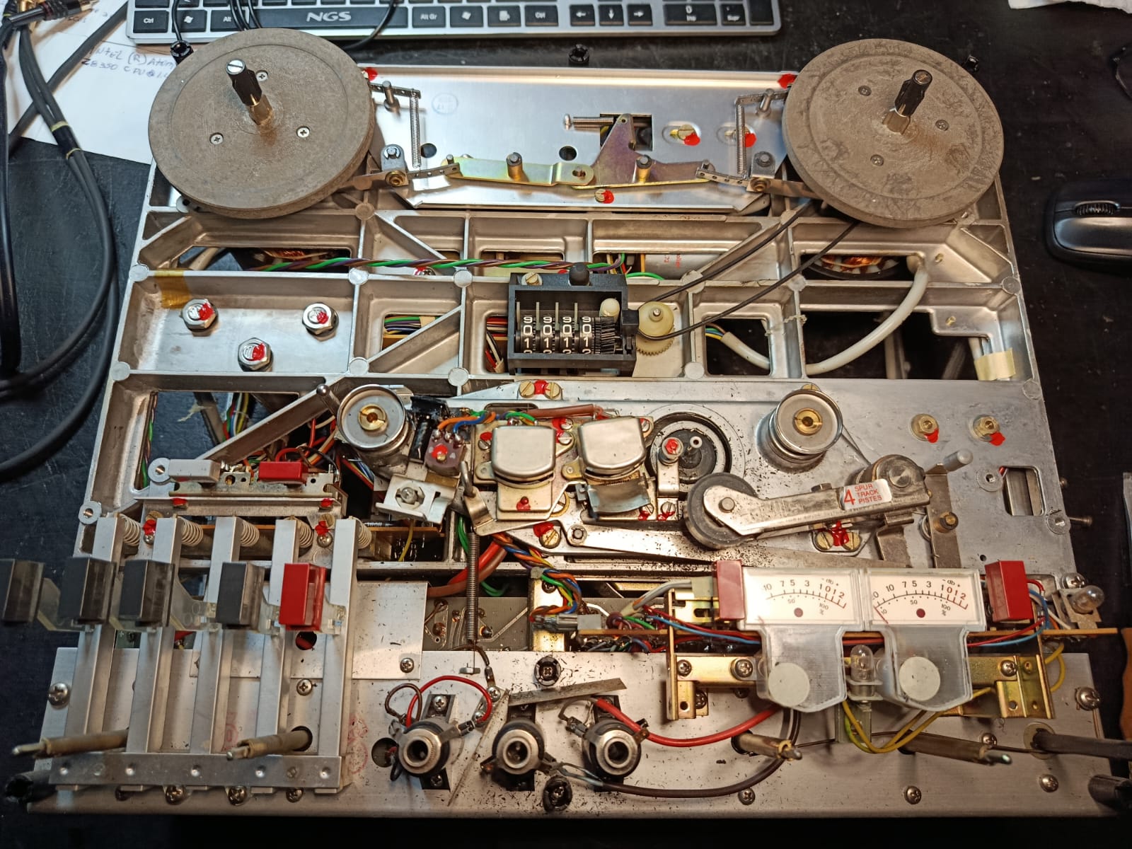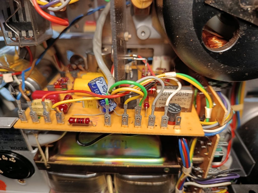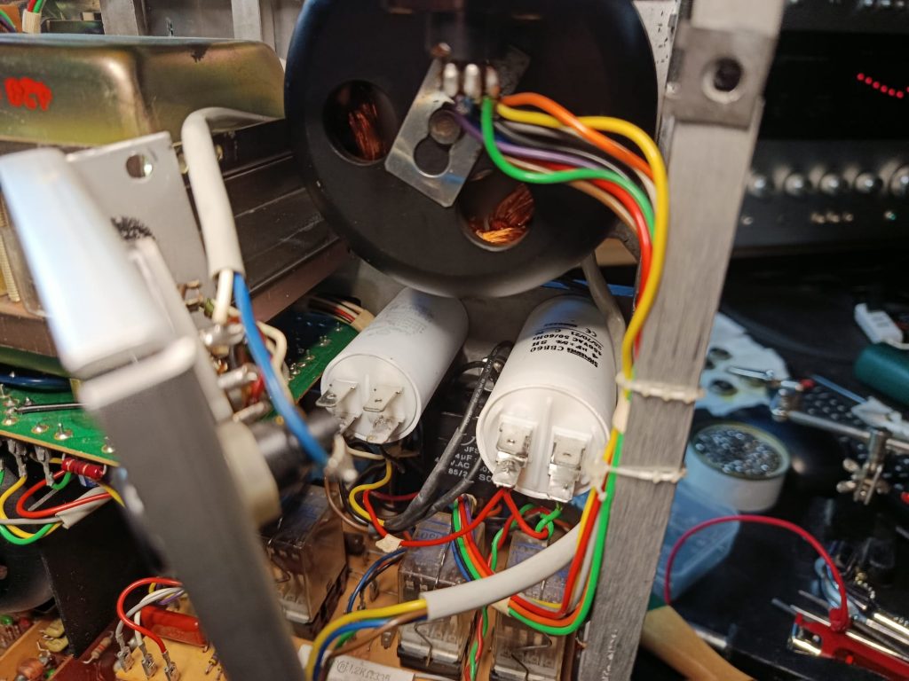 Como se puede observar en la imagen superior, ha visto mejores días. Las mecánicas, evidentemente «dejadas de la mano de Dios»… La correa del contador de cinta, delata su estado vegetativo, sin funcionar. Pero, quien dijo miedo?… Toca empezar por lo básico. Fuente de alimentación y sus respectivos condensadores, que seguramente, estarán dañados.