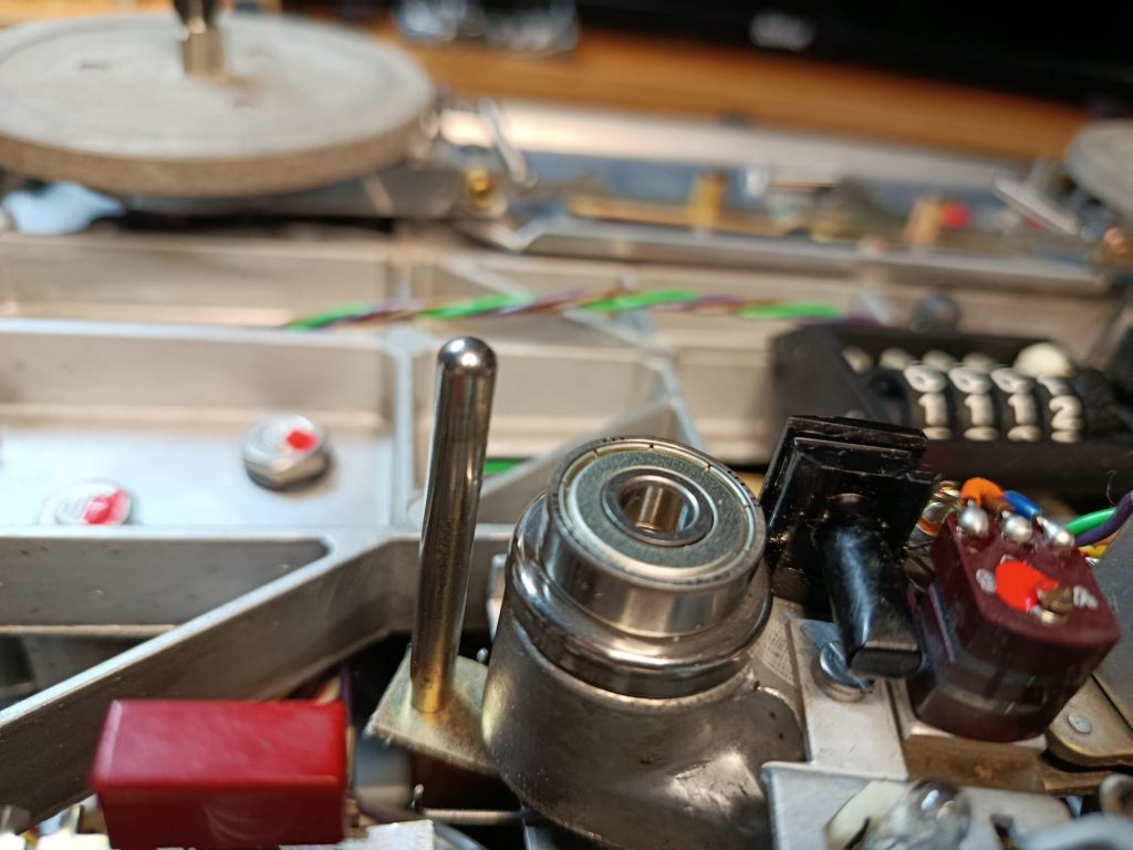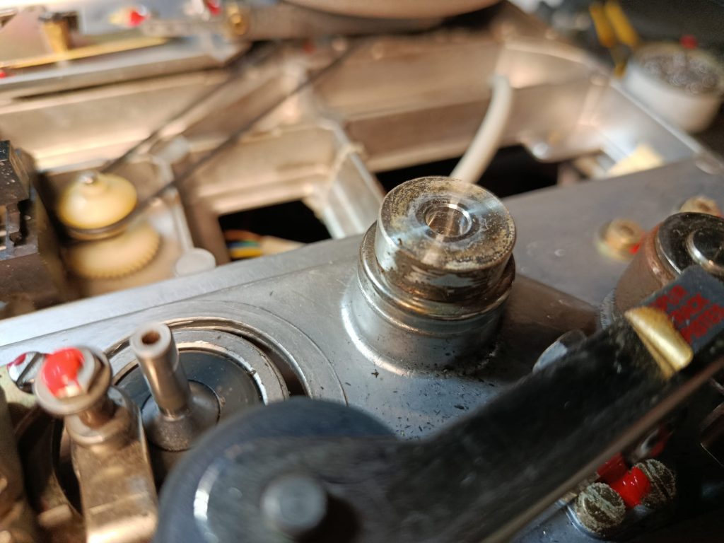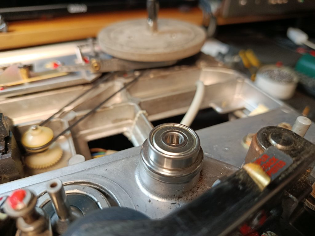 En este caso, y viene así de fábrica, se utiliza un cilindro fijo, que como podemos comprobar, está totalmente también KO. Nosotros le adaptamos un cojinete. Todo trabajo que le ahorremos a los motores, que tienen su edad, bienvenido sea. Faciltaremos el correcto arrastre de cinta, y repetimos, protegeremos a los motores.
